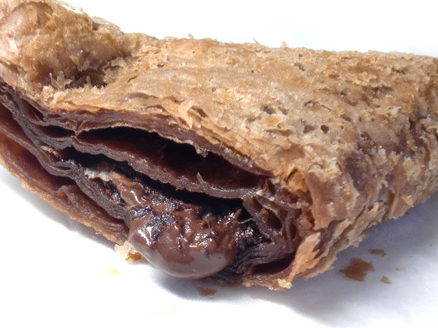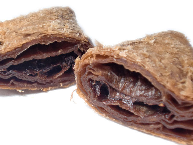 アーモンドの粒が入ったチョコクリームをココアを練り込んだサクサクのパイで包み込んであります。