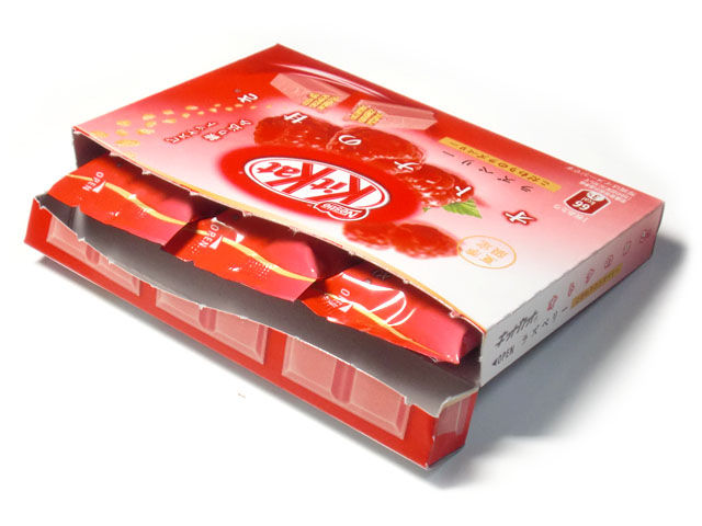 原材料:チョコレートコーチング(植物油脂、砂糖、乳糖、全粉乳、ココアバター)、ビスケット(小麦粉、砂糖、植物油脂、食塩)、小麦粉、植物油脂、乳糖、砂糖、ラズベリー果汁パウダー、全粉乳、イースト、ココアパウダー、カカオマス、ココアバター、乳化剤(大豆を含む)、赤ビート色素、膨張剤、酸味料、香料、重曹、イーストフード