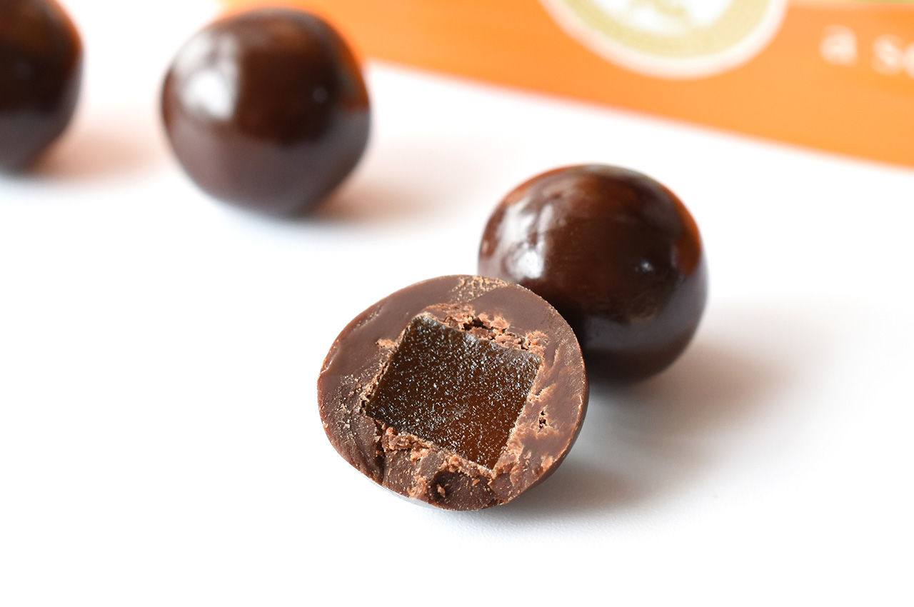 ゼリーは程よい歯ごたえがあり、噛むほどに果汁が溢れ出しチョコレートと溶け合います。