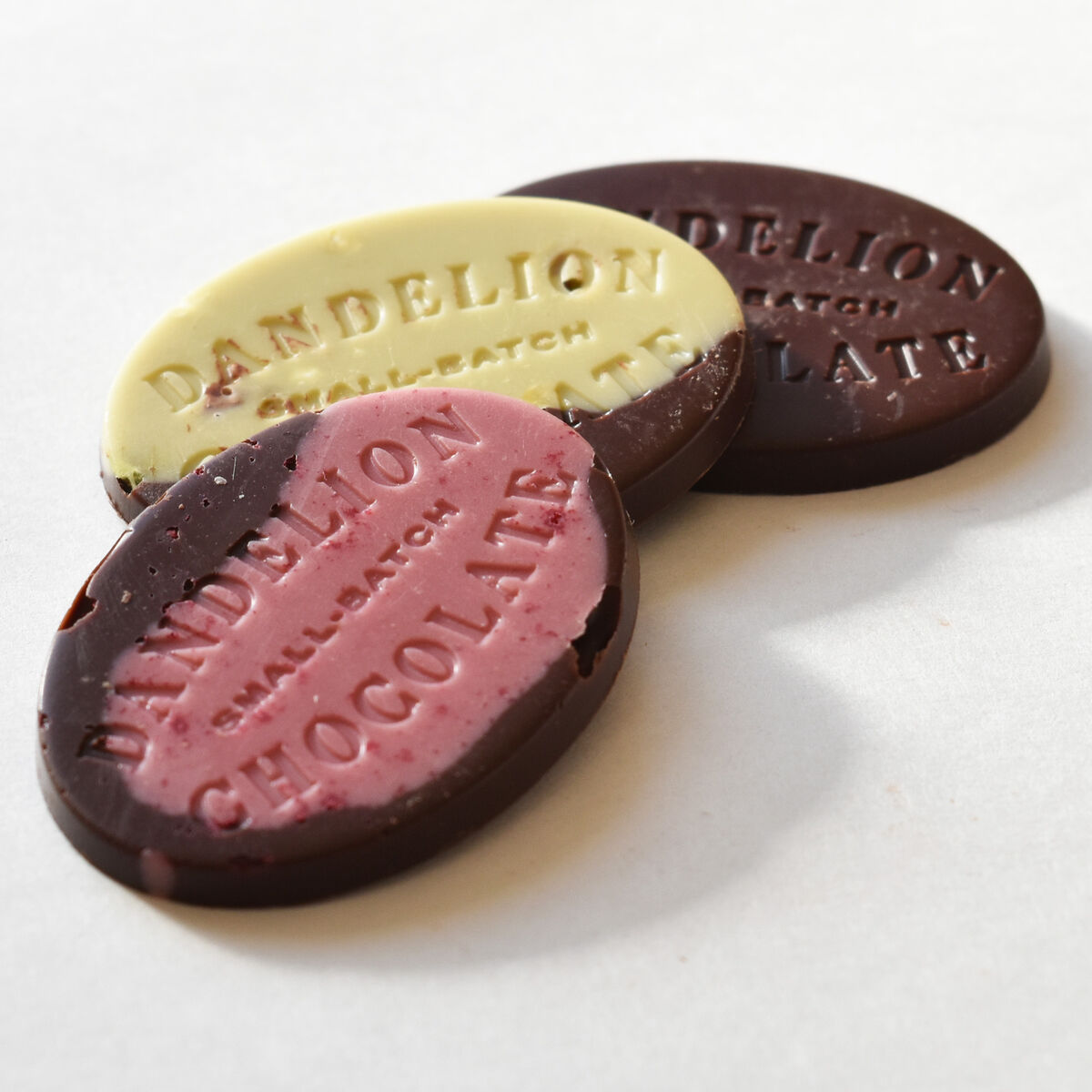 薄い形状のメダル型はなめらかな口溶けが伝わりやすく、それぞれのピュアな味わいが心地よく伝わります。